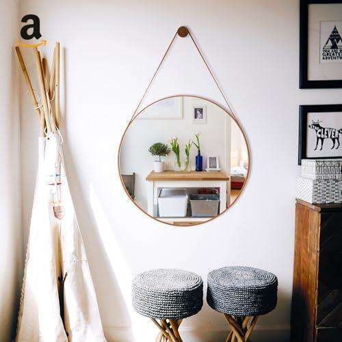 Espelho Decorativo Redondo 60cm Com Alça Couro Caramelo